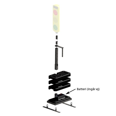 En riktigt stabil stolpfot som byggs ihop för hand, inga delar väger mer än 25kg. Basen består av en galvad stålram med fotstöd för ökad vindstabilitet. Batteriet monteras i 3 st ihåliga belastningar och döljs sedan med en stolpfot som fungerar som lock. Allt kablage är dolt inne i det 1,7 m långa stolpröret.