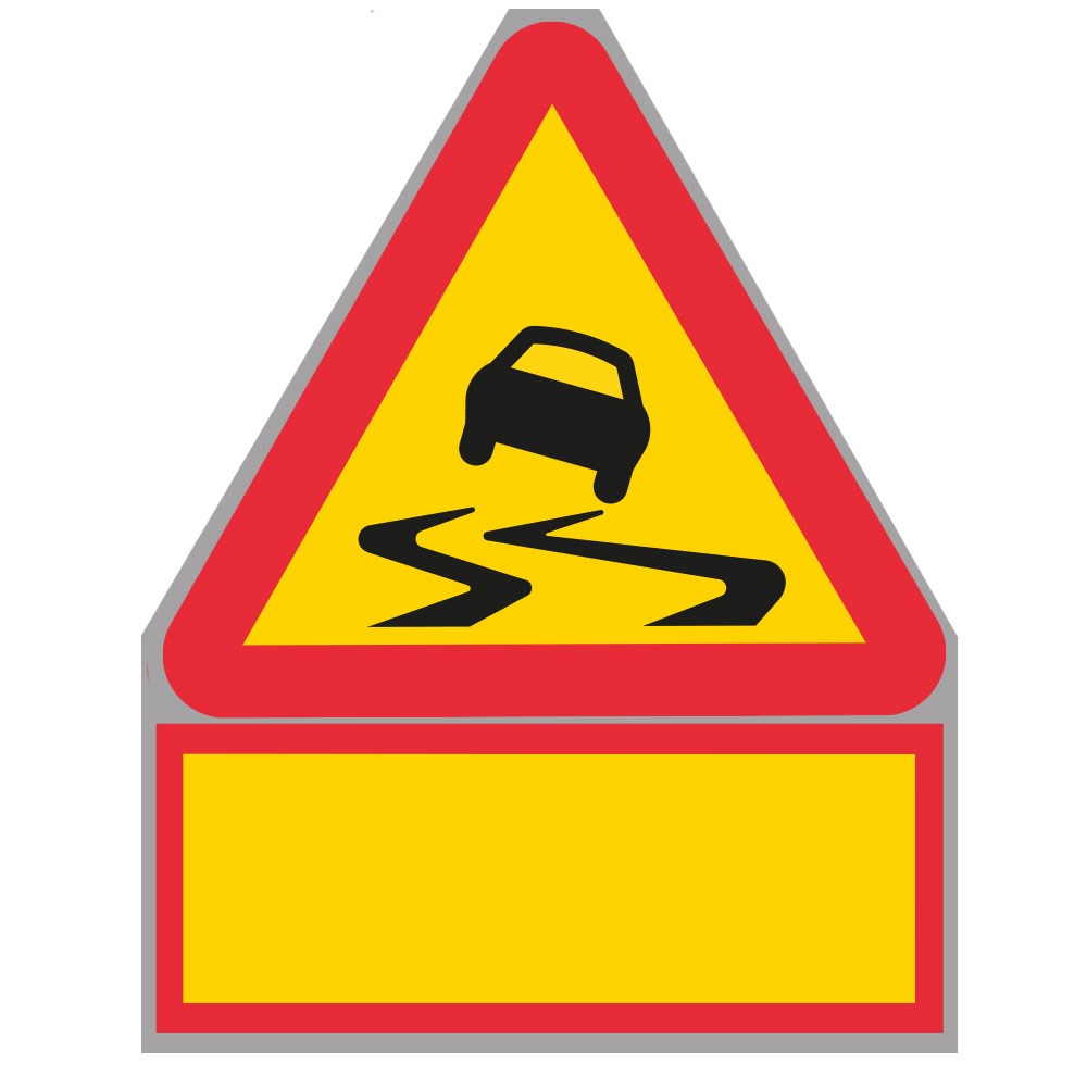 A10 Varning för slirig väg, plastskylt med tilläggstavla. Märket anger att vägen kan vara slirig. Endast om det finns särskilda skäl används märket för att varna för halka på grund av snö eller is.