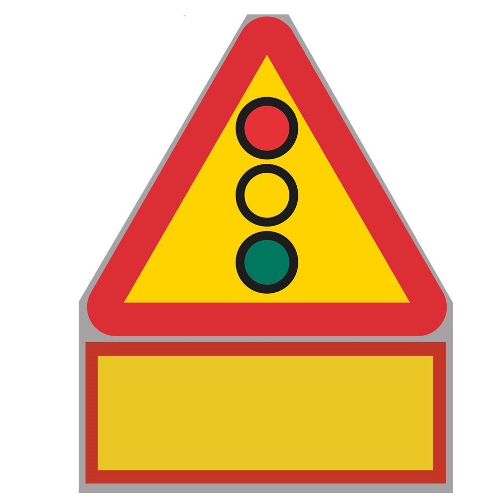 Plastskylt med vägmärke A22 - Varning för flerfärgssignal. Märket anger en plats där trafiken regleras med flerfärgssignal med tre ljusöppningar. Inom tättbebyggt område är märket uppsatt endast om det finns särskilda skäl för det. Märket anger en annan fara än sådan som kan anges med något annat varningsmärke. Valfri text på tilläggstavlan om farans art.