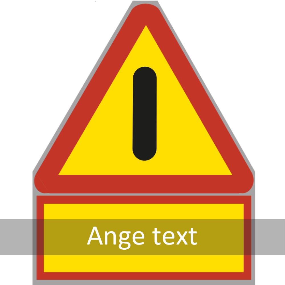 Plastskylt med vägmärke A40 - Varning för annan fara. Märket anger en annan fara än sådan som kan anges med något annat varningsmärke. Valfri text på tilläggstavlan om farans art.