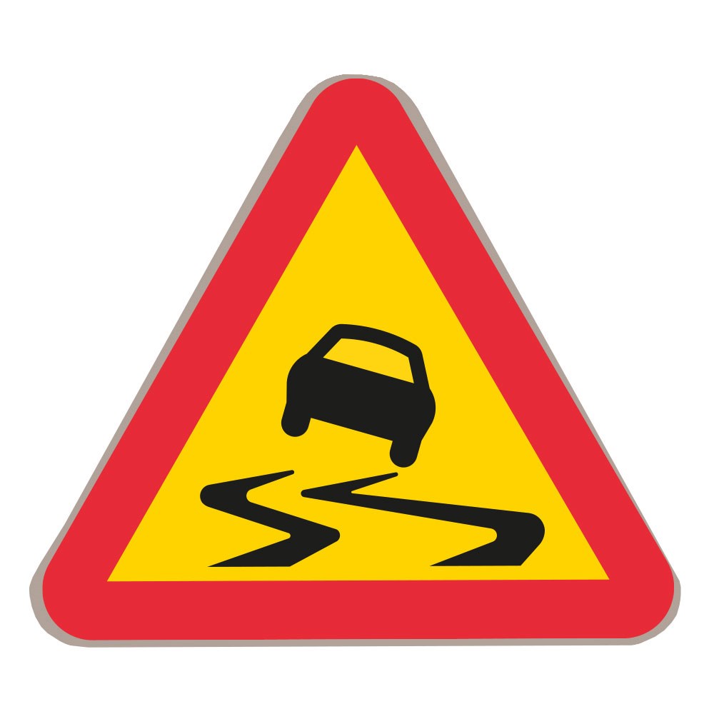 A10 Varning för slirig väg, stor plastskylt. Märket anger att vägen kan vara slirig. Endast om det finns särskilda skäl används märket för att varna för halka på grund av snö eller is.