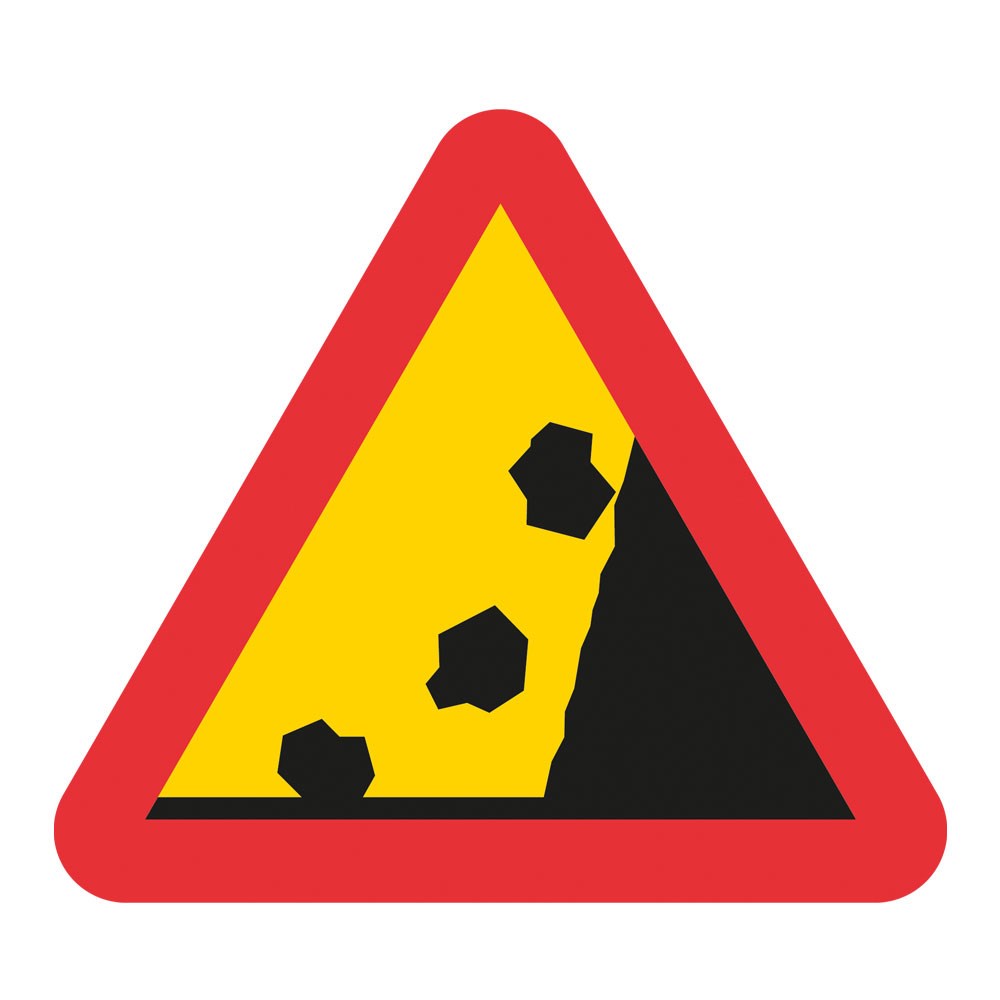 A12 Varning för stenras, plastskylt med handtag. Märket anger risk för stenras och för att stenar kan förekomma på vägen på grund av stenras. Symbolen är anpassad efter förhållandena på platsen.