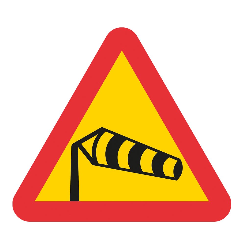 A24 Varning för sidvind, plastskylt. Märket anger en vägsträcka där det ofta förekommer stark sidvind. Symbolen är anpassad efter förhållandena på platsen.