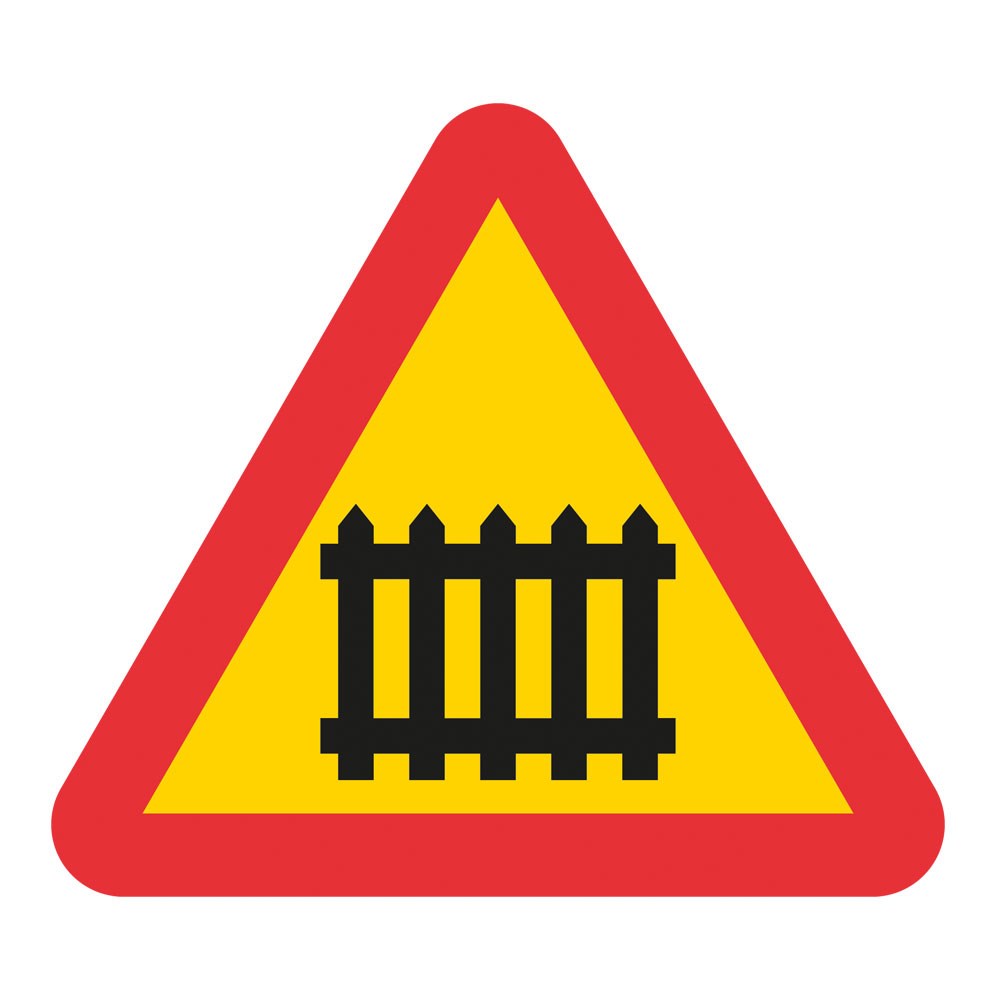 A35 Varning för järnvägskorsning med bommar, plastskylt. Märket anger en korsning med järnväg eller spårväg där det finns bommar.