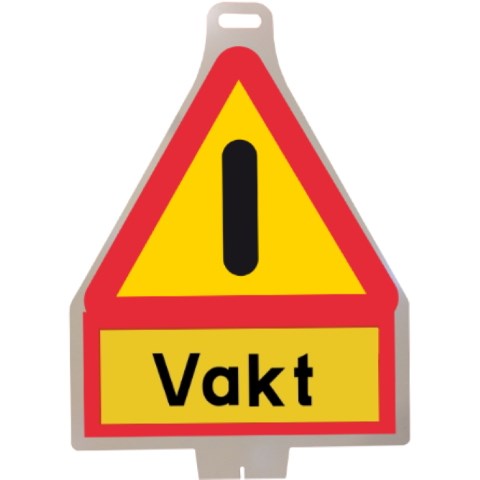 A40 Varning för annan fara, plastskylt med fluorescerande reflex och tilläggstavla med texten "VAKT". Märket anger en vägsträcka där vägarbete eller liknande arbete pågår.