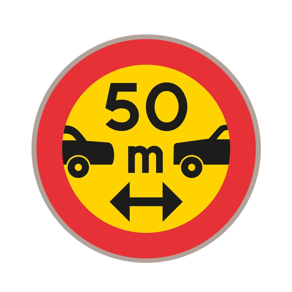 C19 Minsta avstånd, plastskylt. Märket anger förbud mot att hålla kortare avstånd till framförvarande motordrivna fordon i samma färdriktning än som anges på märket. Minsta tillåtna avstånd anges på märket.