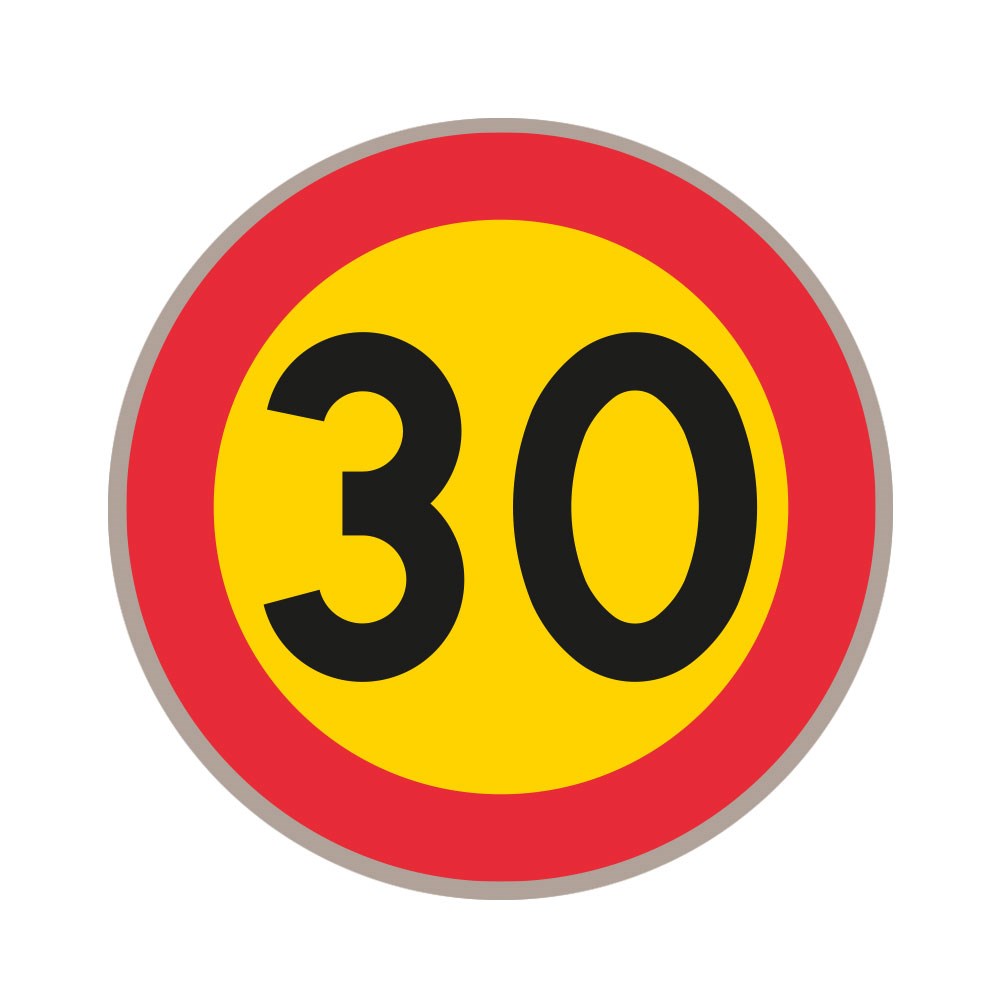 C31-30 Hastighetsbegränsning. Märket anger förbud mot att föra fordon med högre hastighet än den som anges på märket. Angivelsen gäller till den plats där en annan hastighetsbegränsning anges med märket, eller där märke C32, tillfällig hastighetsbegränsning upphör, E7, gågata, eller E9, gångfartsområde, satts upp. Märket behöver inte vara upprepat efter en vägkorsning om samma högsta tillåtna hastighet gäller på den korsande vägen.