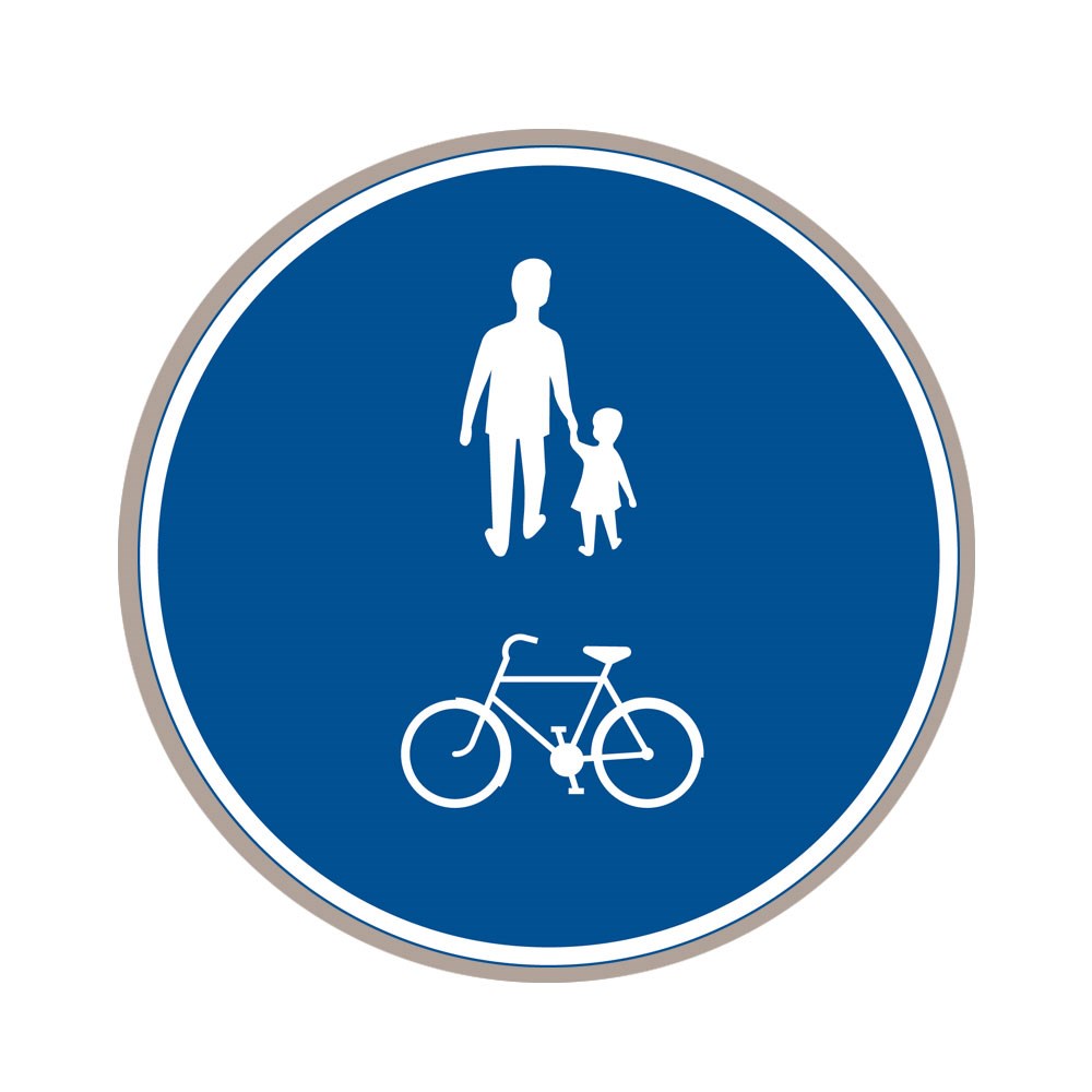 D6. Påbjuden gång- och cykelbana. Märket anger gemensam bana för gående och cyklande. Om moped klass II inte får föras på banan anges det på en tilläggstavla.