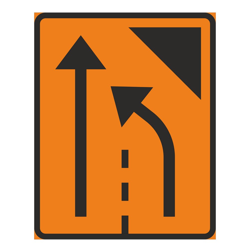 F25 Körfält upphör. Märket anger att ett körfält tillfälligt är avstängt och att ett annat körfält kan användas i färdriktningen. Märket är anpassat efter förhållandena på platsen. Avvikelse från färg får inte ske.