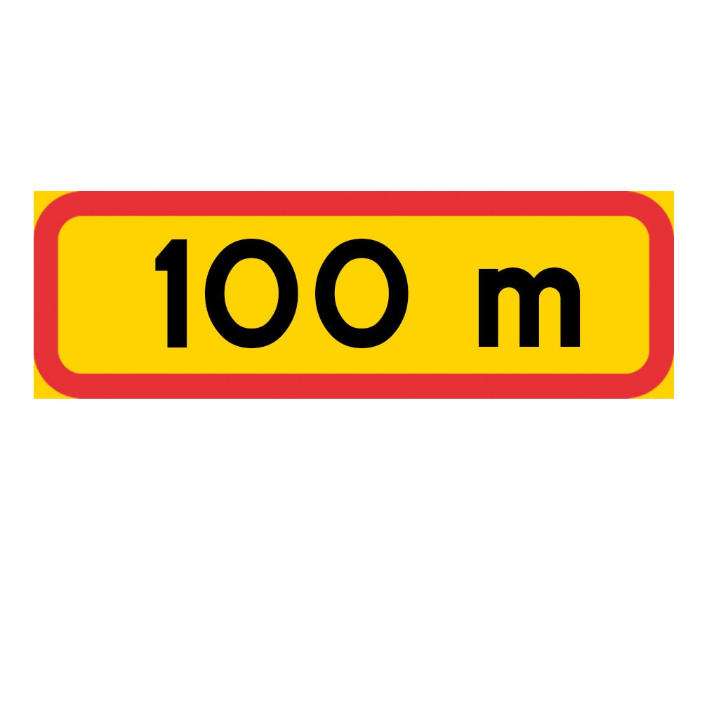 Tilläggstavla "100 m", plastskylt 770x295 mm. Tilläggstavlor ger kompletterande anvisningar till vägmärken, till exempel ange ett avstånd, en vägsträckas längd eller en tidsangivelse.