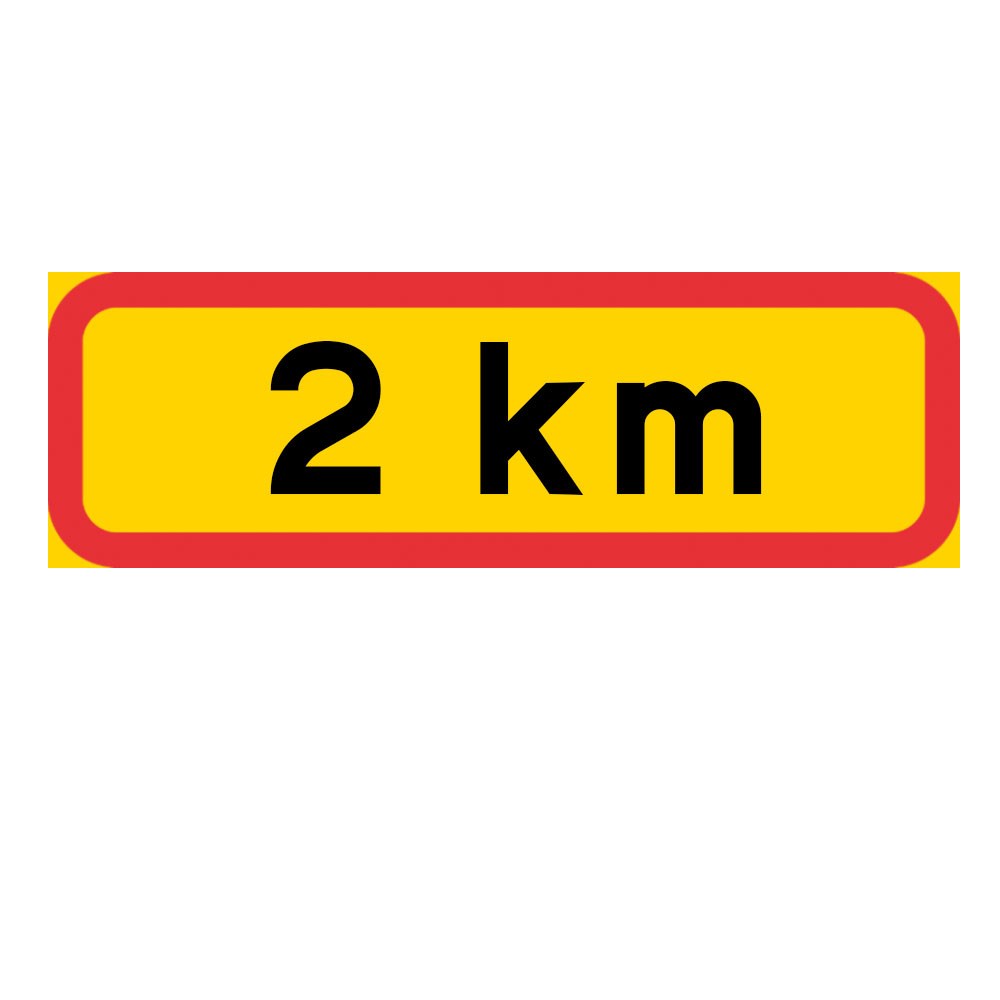 Tilläggstavla "2 km", plastskylt 770x295 mm. Tilläggstavlor ger kompletterande anvisningar till vägmärken, till exempel ange ett avstånd, en vägsträckas längd eller en tidsangivelse.