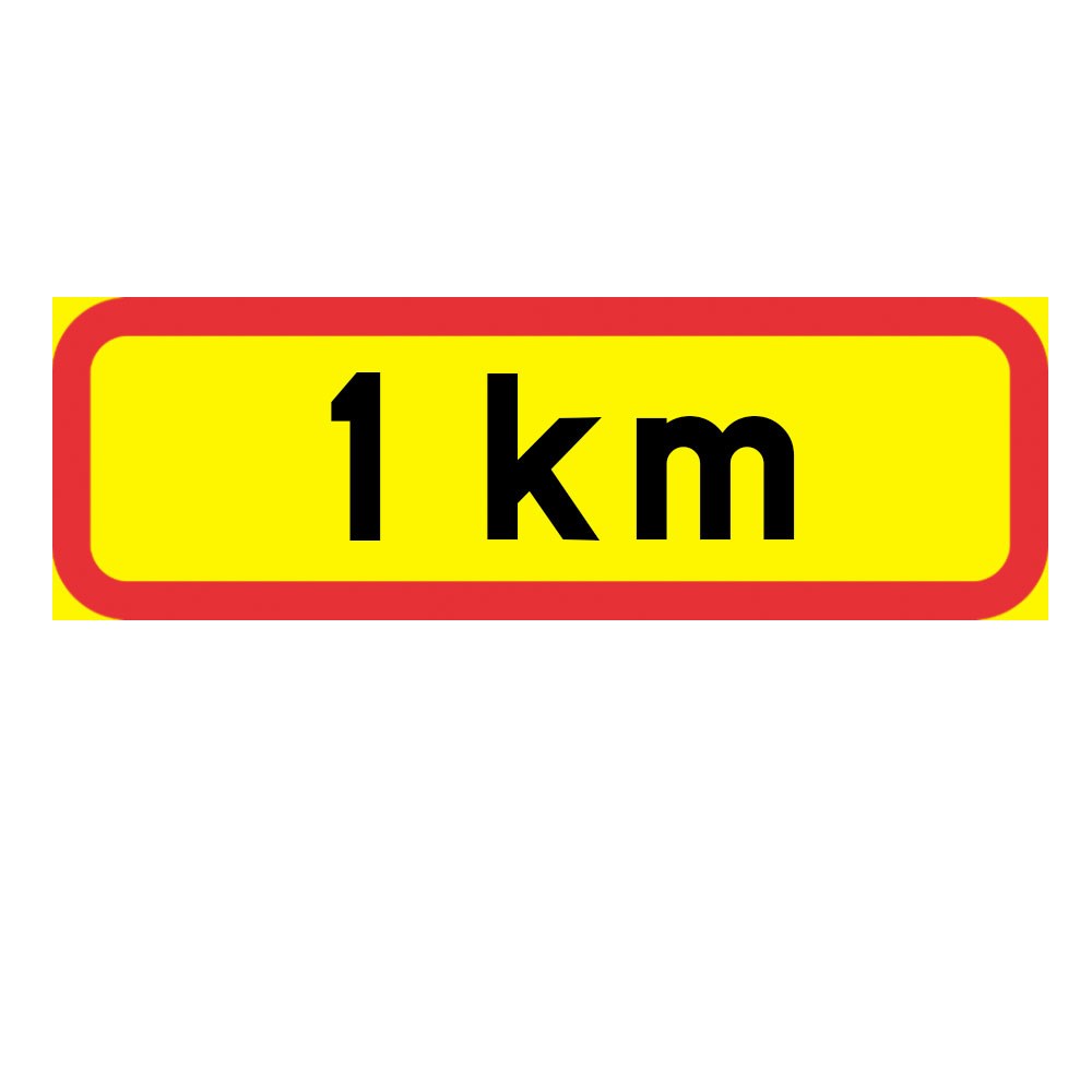 Tilläggstavla "1 km", plastskylt 770x295 mm i fluorescerande reflex. Tilläggstavlor ger kompletterande anvisningar till vägmärken, till exempel ange ett avstånd, en vägsträckas längd eller en tidsangivelse.