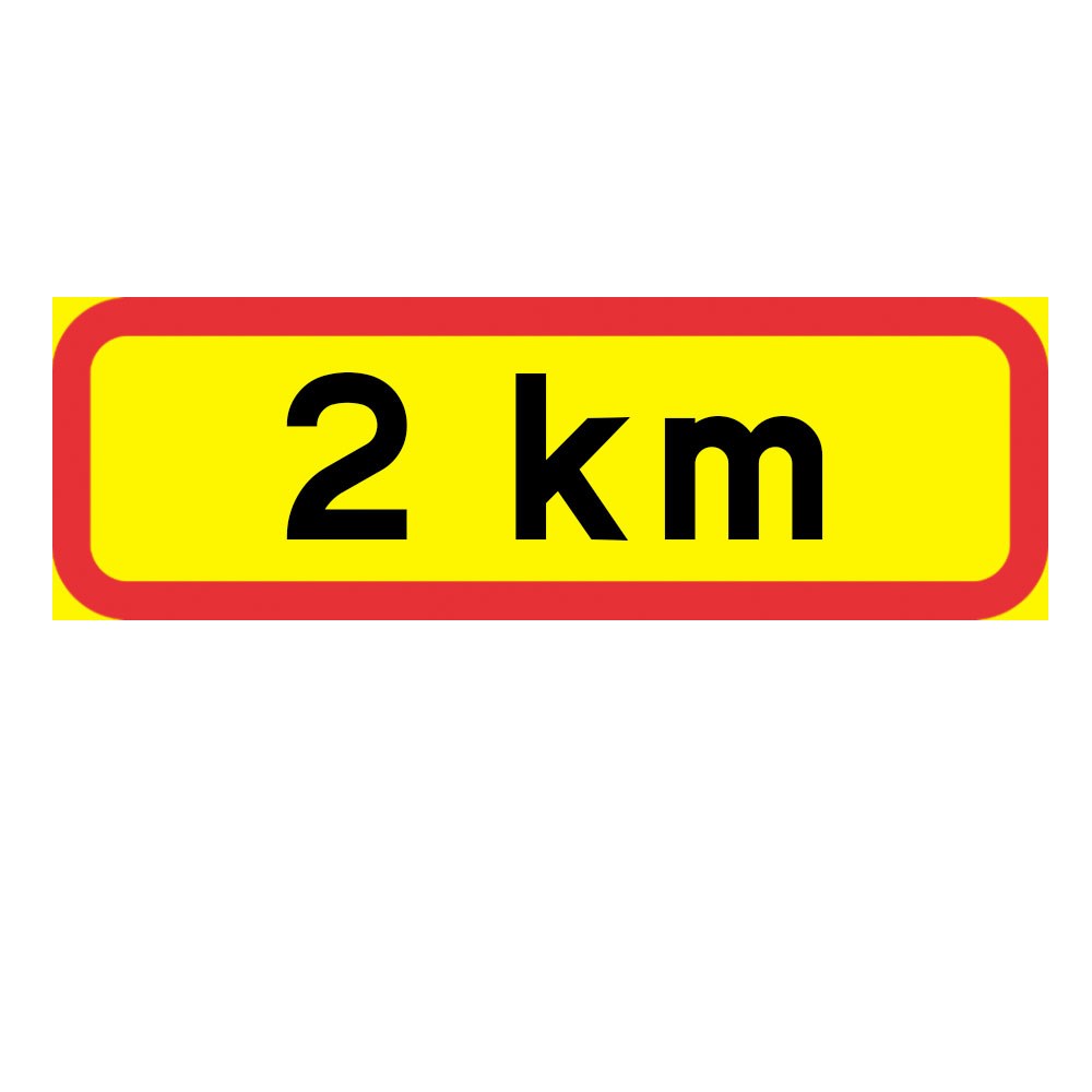 Tilläggstavla "2 km", plastskylt 770x295 mm i fluorescerande reflex. Tilläggstavlor ger kompletterande anvisningar till vägmärken, till exempel ange ett avstånd, en vägsträckas längd eller en tidsangivelse.