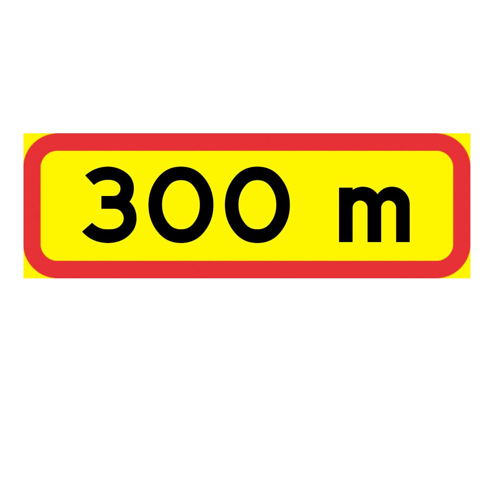Tilläggstavla "300 m", plastskylt 770x295 mm i fluorescerande reflex. Tilläggstavlor ger kompletterande anvisningar till vägmärken, till exempel ange ett avstånd, en vägsträckas längd eller en tidsangivelse.