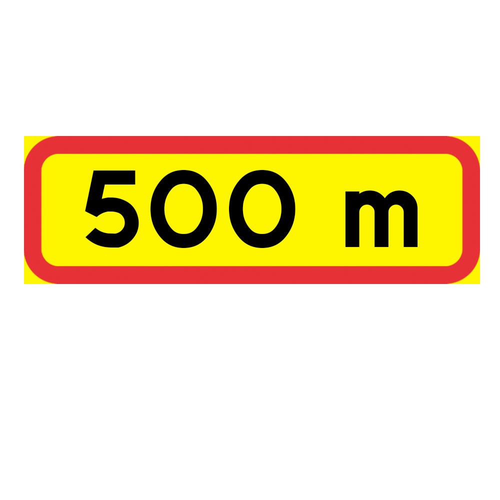 Tilläggstavla "500 m", plastskylt 770x295 mm i fluorescerande reflex. Tilläggstavlor ger kompletterande anvisningar till vägmärken, till exempel ange ett avstånd, en vägsträckas längd eller en tidsangivelse.