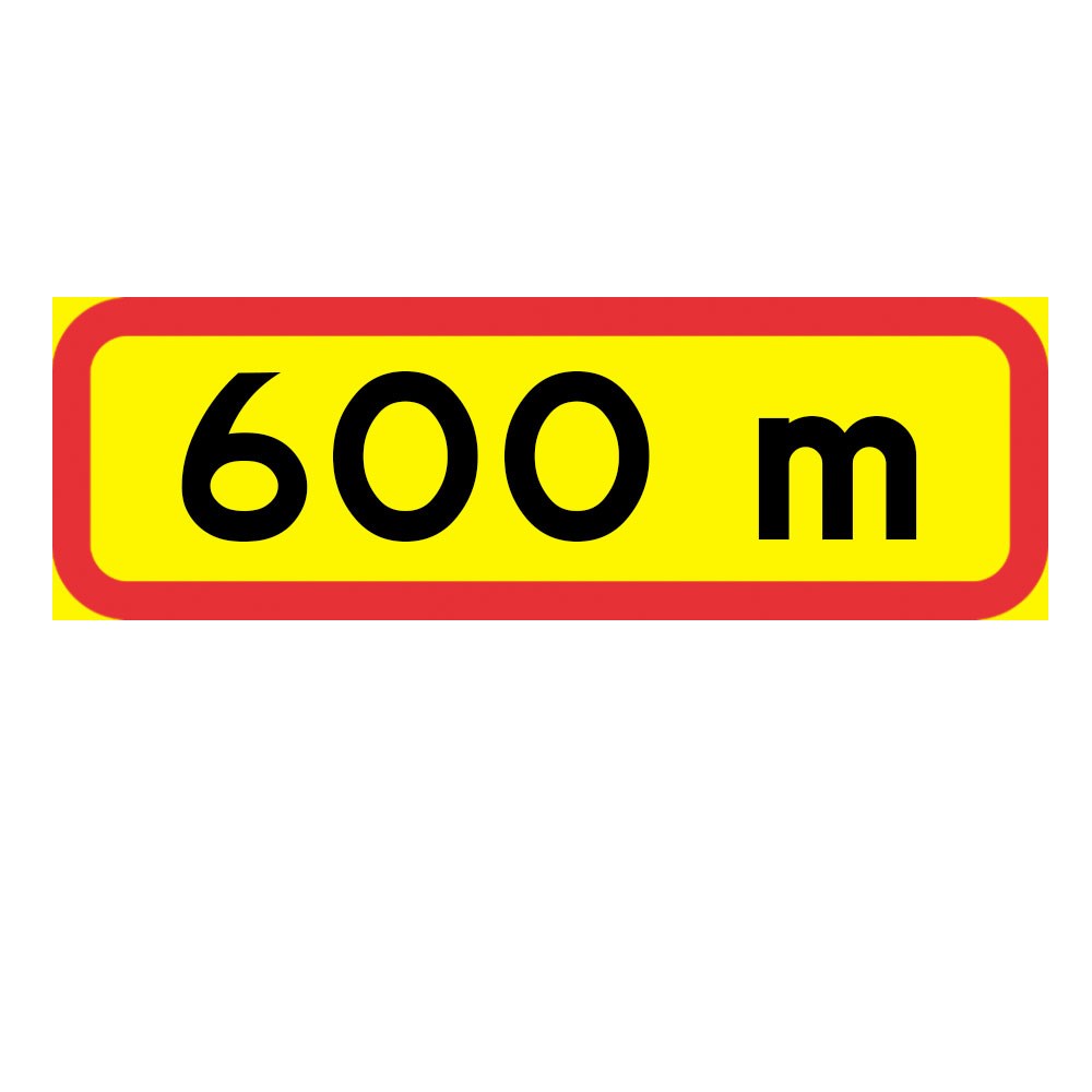 Tilläggstavla "600 m", plastskylt 770x295 mm i fluorescerande reflex. Tilläggstavlor ger kompletterande anvisningar till vägmärken, till exempel ange ett avstånd, en vägsträckas längd eller en tidsangivelse.